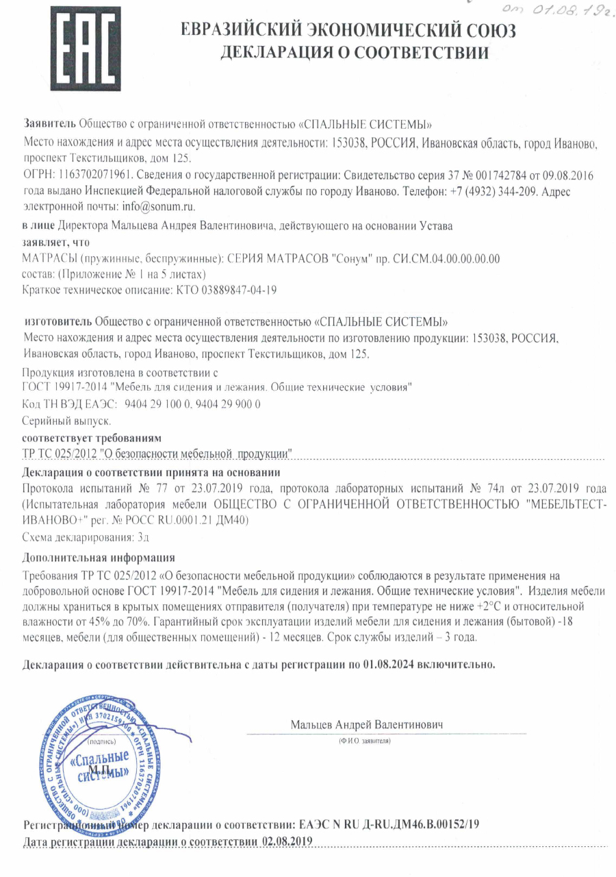 Гарантийные сроки от 18 месяцев до 60 месяцев, с даты, которая указана в накладной, в зависимости от модели матраса
